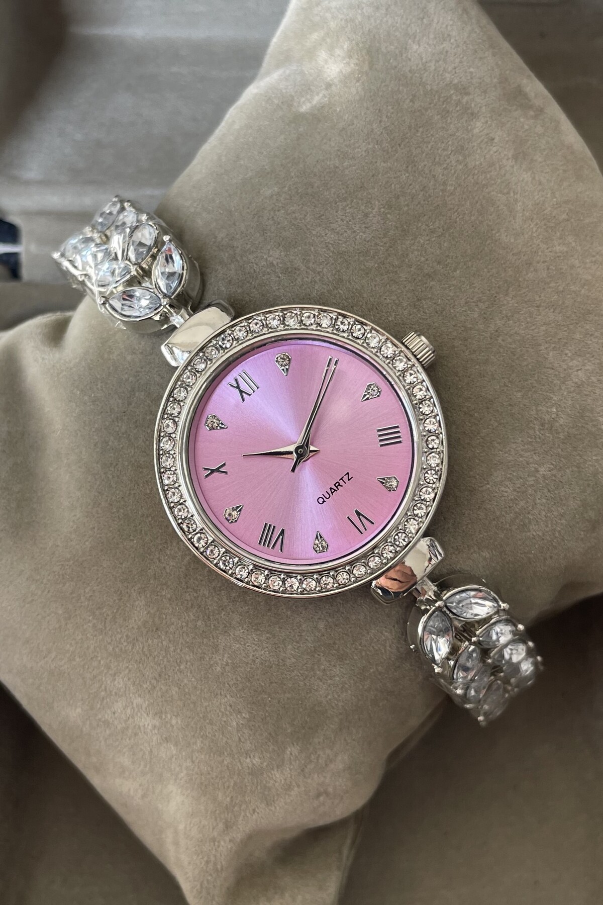 Taşlı çerçevesi ve pembe kadranıyla şık kristal kordonlu kadın kol saati